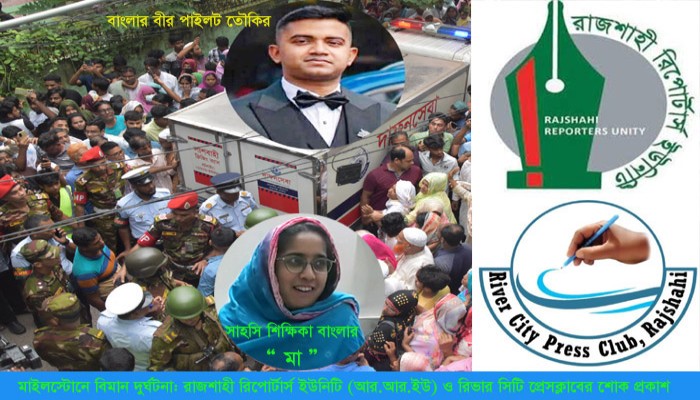 রিভার সিটি প্রেসক্লাব ও রাজশাহী রিপোর্টার্স ইউনিটি (আরআরইউ) এর নেতৃবৃন্দ এক বার্তায় বাংলাদেশ বিমান বাহিনীর প্রশিক্ষণ বিমান দুর্ঘটনায় ফ্লাইট লেপ্টন্যান্ট তৌকির ইসলাম সাগর, মাইলস্টোন স্কুল অ্যান্ড কলেজের শিক্ষিকা মাহিরীন চৌধুরী এবং শিশু-সহ আরও যারা প্রাণ হারিয়েছেন তাদের প্রতি গভীর শোক ও দুঃখ প্রকাশ করেছেন এবং শোকসন্তপ্ত পরিবারের প্রতি গভীর সমবেদনা জানিয়েছেন রাজশাহী রিপোর্টার্স ইউনিটি (আরআরইউ), এর সভাপতি আব্দুল মুগণী নিরো ও সাধারণ সম্পাদক মোঃ আবু হেনা মোস্তফা জামান, সাংগঠনিক সম্পাদক জুবায়ের আলম রাজন ও মানবতার ফেরিওয়ালা বিশিষ্ট সমাজ সেবক ও ব্যবসায়ী ও রাজনীতিবিদ ইঞ্জিনিয়ার মোহাম্মদ আরিফুজ্জামান সোহেল।