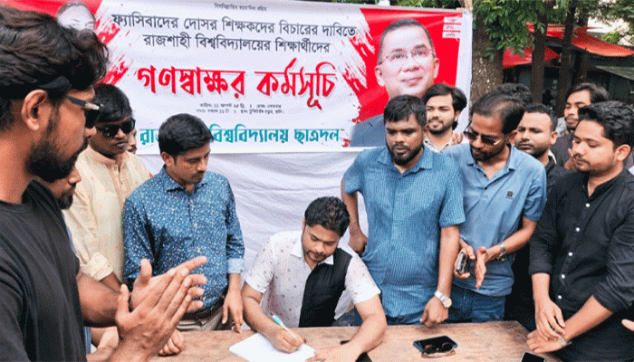 রাবি শাখা ছাত্রদলের সভাপতি সুলতান আহমেদ রাহী বলেন, ফ্যাসিস্ট হাসিনাকে ক্ষমতায় টিকিয়ে রাখতে যারা সহায়তা করেছে, সেই সব সন্ত্রাসী ও দুর্নীতিবাজ শিক্ষকদের গ্রেপ্তারের দাবিতে ইতোমধ্যে একাধিক কর্মসূচি পালন করা হয়েছে। কিন্তু বিশ্ববিদ্যালয় প্রশাসন স্বজনপ্রীতির কারণে কোনো পদক্ষেপ নেয়নি। এ পরিস্থিতিতে শিক্ষার্থীদের মতামতের ভিত্তিতে গণস্বাক্ষর কর্মসূচি শুরু করা হয়েছে, যা আগামী ১৫ আগস্ট পর্যন্ত চলবে।