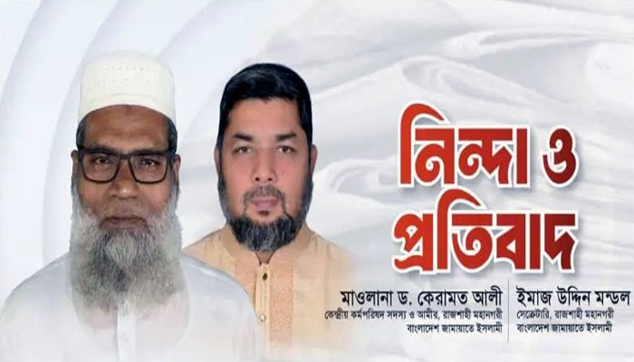 রাজশাহী মহানগরীর আমীর ড. মাওলানা কেরামত আলী ও সেক্রেটারি ইমাজ উদ্দিন মন্ডল এক যৌথ বিবৃতিতে বলেন, কিছু উচ্ছৃঙ্খল কিছু শিক্ষার্থীর দ্বারা নির্যাতন নিপীড়ন গ্রহণযোগ্য নয়। দোষীদের শনাক্ত করে দ্রুত সময়ে দৃষ্টান্তমূলক শাস্তি দাবি করেন তারা। বিবৃতিতে বিশ্ববিদ্যালয় প্রশাসন, শিক্ষক, কর্মকর্তা ও কর্মচারীদের নিরাপত্তা নিশ্চিত করার উপরে জোর দেওয়া হয়েছে।