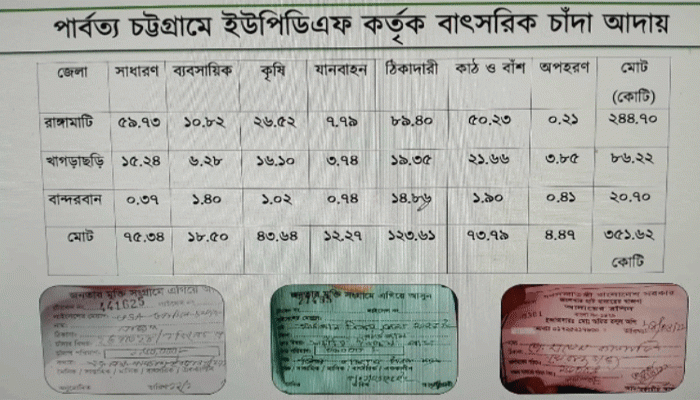 তিন পার্বত্য জেলা থেকে বছরে ৩৫০ কোটি টাকার চাঁদাবাজি করছে এই সন্ত্রাসী গোষ্ঠী ইউপিডিএফ। ব্যবসায়ী, কৃষি, যানবাহন, ঠিকাদার, কাঠ, বাঁশ, সাধারণ ও অপহরণ খাত থেকে আসে এই বিপুল অংকের টাকা। তার বিরাট অংশ ব্যয় করছে অস্ত্র গোলাবারুদ কেনায়। পার্বত্য চট্টগ্রামকে অস্থিতিশীল করতে সীমান্ত পথে আসছে ভারী যুদ্ধাস্ত্র আর গোলাবারুদ। এসব অস্ত্রের উৎসও ভারত। সাম্প্রতিককালে মিয়ানমারের আরাকান আর্মির হাত ধরেও ভারী আগ্নেয়াস্ত্র আসছে ইউপিডিএফ সন্ত্রাসীদের হাতে। ভারতেই বাংলাদেশ বিরোধী সশস্ত্র সন্ত্রাসীদের আস্তানা রয়েছে এ অভিযোগ রয়েছে দীর্ঘদিনের। তবে সম্প্রতি খাগড়াছড়িতে কথিত একটি ধর্ষণের ঘটনাকে কেন্দ্র করে সন্ত্রাসী গোষ্ঠী ইউপিডিএফের নজিরবিহীন সন্ত্রাসী তাণ্ডবের পর এ বিষয়টি ফের আলোচনায় এসেছে।