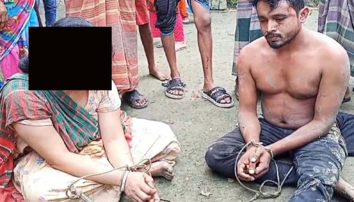 পরদিন রোববার সকালে স্থানীয় গণ্যমান্য ব্যক্তিদের নিয়ে স্বামী তালা খুলে কথিত প্রেমিক রাকেশ-সহ তার স্ত্রীকে ঘর থেকে বের করে বেঁধে মারপিট করেন। এ সময় বাড়িতে এলাকার উৎসুক মানুষের ভিড় জমে। একপর্যায়ে হাজিরহাট পূজা উদযাপন কমিটির সভাপতি বিকাশ রায়, হরিদাসকাটি ইউনিয়ন বিএনপির সাধারণ সম্পাদক নবিরুজ্জামান আজাদসহ এলাকার গণ্যমান্য ব্যক্তির উপস্থিতিতে বিষয়টি নিয়ে সালিশি সভার আয়োজন করা হয়।