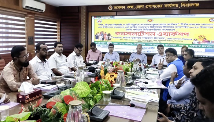সিরাজগঞ্জ জেলা তথ্য অফিসের আয়োজনে এবং ইউনিসেফের আর্থিক সহযোগিতায় জেলা প্রশাসকের সম্মেলন কক্ষেআজ বুধবার (৮ অক্টোবর) সকালেটাইফয়েড টিকাদান ক্যাম্পেইন-২০২৫ উপলক্ষে জেলা পর্যায়ে মিডিয়াকর্মীদের অংশগ্রহণেকনসালটেশন ওয়ার্কশপঅনুষ্ঠিত হয়েছে। ওয়ার্কশপে সভাপতিত্ব করেন জেলা প্রশাসক মুহাম্মদ নজরুল ইসলাম।