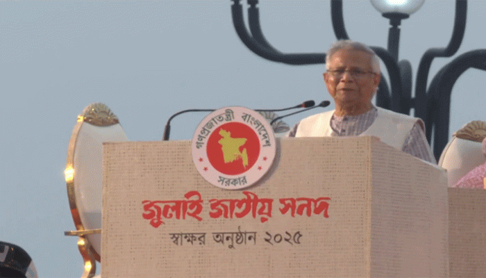 এর আগে দীর্ঘ আট মাসের সংলাপ ও মতৈক্য প্রক্রিয়ার মধ্যদিয়ে চূড়ান্ত হওয়া ঐতিহাসিক ‘জুলাই জাতীয় সনদ ২০২৫’-এ বিভিন্ন রাজনৈতিক দলগুলোর প্রতিনিধিদের স্বাক্ষরের পর প্রধান উপদেষ্টা অধ্যাপক ড. মুহাম্মদ ইউনূসও স্বাক্ষর করেন।