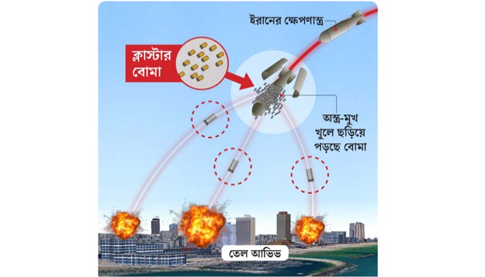 ইংরেজিতে ‘ক্লাস্টার’ শব্দের অর্থ ‘একগুচ্ছ’। ক্লাস্টার বোমার মধ্যে আসলে থাকে একগুচ্ছ ছোট ছোট বোমা। ছোট, কিন্তু শক্তিশালী। একটি বড় ক্ষেপণাস্ত্রের মোড়কে ওই ছোট বোমাগুলি ভরা থাকে। উৎক্ষেপণের পর শূন্যেই খুলে যায় ক্লাস্টার বোমার অস্ত্র-মুখ। ভিতর থেকে ছোট ছোট বোমাগুলি বেরিয়ে আসে এবং বিস্তীর্ণ অংশে ছড়িয়ে পড়ে। ইরানের ১৯ জুনের হামলার পর ইজ়রায়েলের সেনাবাহিনী জানায়, মাটি থেকে সাত কিলোমিটার উচ্চতায় ওই অস্ত্রের মুখ খুলেছিল। তা থেকে বেরিয়ে এসেছিল অন্তত ২০টি বোমা। সেগুলি মধ্য ইজ়রায়েলের বিভিন্ন প্রান্তে আট কিলোমিটার পর্যন্ত এলাকায় ছড়িয়ে পড়ে।
