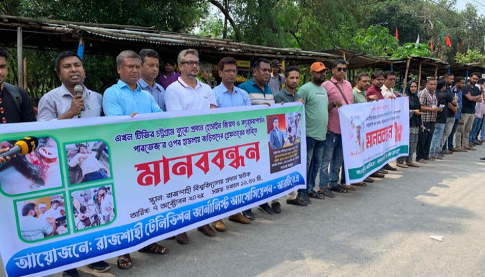 চট্টগ্রামে সাংবাদিকদের ওপর হামলা: জড়িতদের দ্রুত গ্রেপ্তার ও শাস্তির দাবিতে রাজশাহী টেলিভিশন জার্নালিস্ট অ্যাসোসিয়েশনের মানববন্ধন